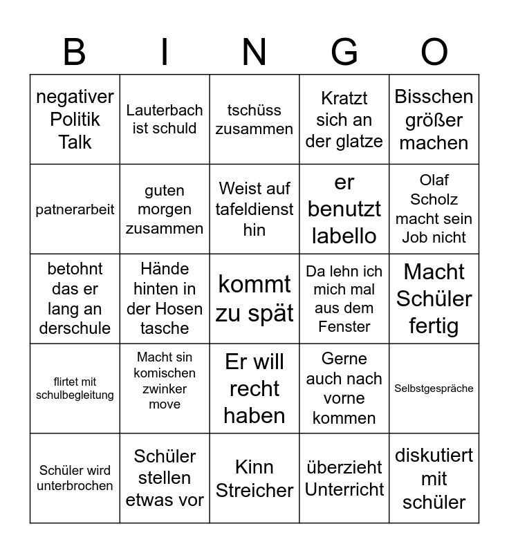 This bingo card has a free space and 24 words: Macht sin komischen zwinker move, Schüler stellen etwas vor, Weist auf tafeldienst hin, Schüler wird unterbrochen, Bisschen größer machen, negativer Politik Talk, patnerarbeit, Lauterbach ist schuld, Da lehn ich mich mal aus dem Fenster, Er will recht haben, er benutzt labello, betohnt das er lang an derschule, Gerne auch nach vorne kommen, Selbstgespräche, guten morgen zusammen, überzieht Unterricht, Macht Schüler fertig, tschüss zusammen, Olaf Scholz macht sein Job nicht, Hände hinten in der Hosen tasche, diskutiert mit schüler, flirtet mit schulbegleitung, Kratzt sich an der glatze and Kinn Streicher.