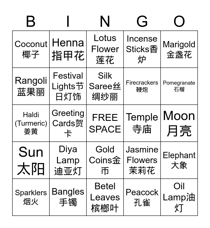 This bingo card has a free space and 24 words: Diya Lamp 迪亚灯, Bangles手镯, Silk Saree丝绸纱丽, Sparklers烟火, Marigold 金盏花, Coconut椰子, Rangoli 蓝果丽, Henna指甲花, Temple 寺庙, Gold Coins金币, Firecrackers鞭炮, Haldi (Turmeric)姜黄, Jasmine Flowers 茉莉花, Elephant 大象, Festival Lights节日灯饰, Peacock孔雀, Moon月亮, Lotus Flower莲花, Pomegranate 石榴, Greeting Cards贺卡, Oil Lamp油灯, Sun太阳, Incense Sticks香炉 and Betel Leaves 槟榔叶.