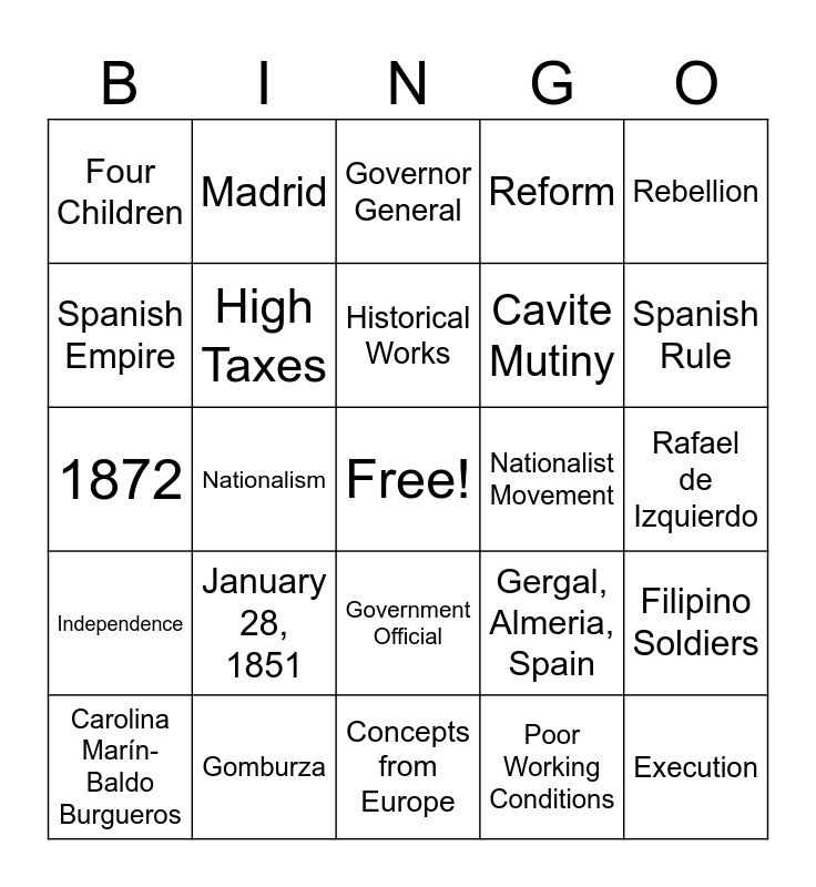 This bingo card has a free space and 24 words: January 28, 1851, Gomburza, Historical Works, Carolina Marín-Baldo Burgueros, Rebellion, Four Children, Spanish Empire, Madrid, Nationalist Movement, Government Official, Cavite Mutiny, 1872, Gergal, Almeria, Spain, Filipino Soldiers, High Taxes, Poor Working Conditions, Rafael de Izquierdo, Governor General, Spanish Rule, Nationalism, Execution, Independence, Reform and Concepts from Europe.