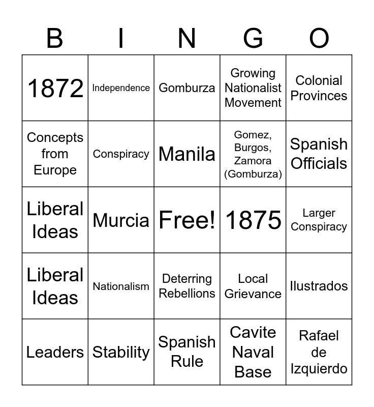 This bingo card has a free space and 47 words: Poor Working Conditions, Rafael de Izquierdo, Governor General, Spanish Rule, Nationalism, Execution, Independence, Reform, Concepts from Europe, Strengthened Opposition, Conspiracy, Growing Nationalist Movement, Ilustrados, Local Grievance, José Antonio Julián Montero y Vidal, Born, Manila, 1875, Civil Governor, Colonial Provinces, Murcia, Cavite Naval Base, 1872, Gomez, Burgos, Zamora (Gomburza), Rebellion, Spanish Officials, Leaders, Showing Force, Deterring Rebellions, Liberal Ideas, European Influence, Threat to Authority, Harsh Actions, Executions, Restoring Peace, Stability, Larger Conspiracy, Overthrow Spanish Rule, Nationalist Movement, Military Personnel, Filipino Clergy, Gomburza, Liberal Ideas, Republican Ideas, Europe, Ilustrados and Local Grievance.