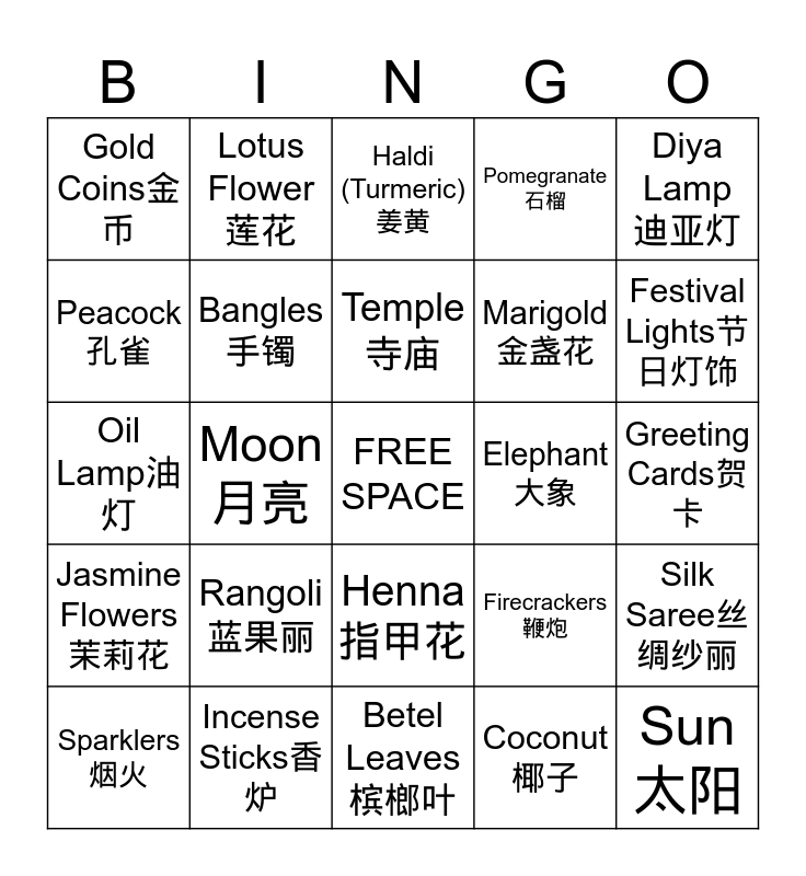 This bingo card has a free space and 24 words: Rangoli 蓝果丽, Incense Sticks香炉, Temple 寺庙, Sparklers烟火, Diya Lamp 迪亚灯, Gold Coins金币, Peacock孔雀, Lotus Flower莲花, Elephant 大象, Henna指甲花, Marigold 金盏花, Oil Lamp油灯, Firecrackers鞭炮, Silk Saree丝绸纱丽, Bangles手镯, Coconut椰子, Greeting Cards贺卡, Haldi (Turmeric)姜黄, Festival Lights节日灯饰, Moon月亮, Sun太阳, Jasmine Flowers 茉莉花, Pomegranate 石榴 and Betel Leaves 槟榔叶.