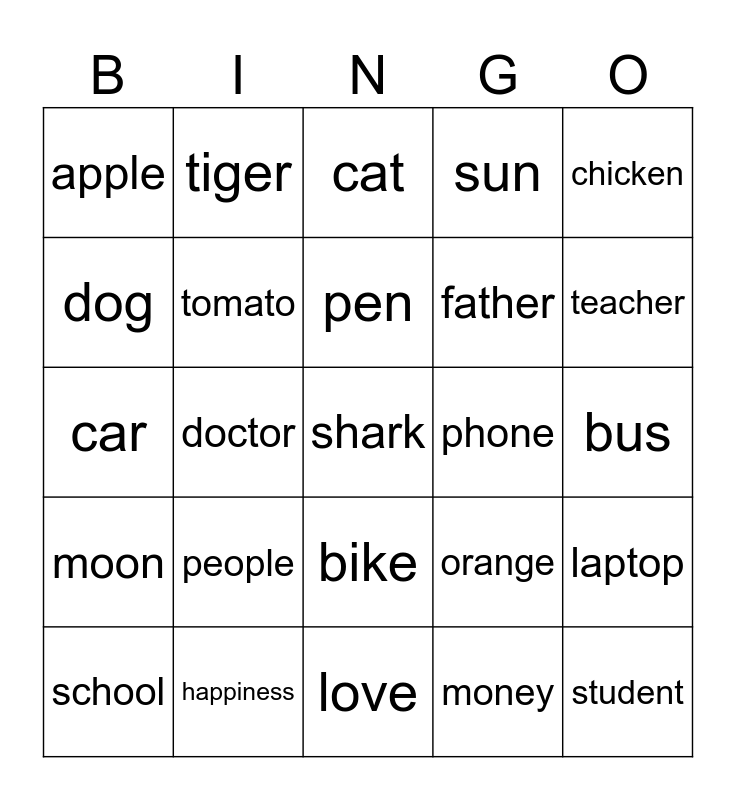This bingo card has a free space and 24 words: people, happiness, pen, school, chicken, apple, dog, tiger, phone, bike, father, car, orange, laptop, tomato, money, bus, cat, teacher, doctor, student, moon, sun and love.
