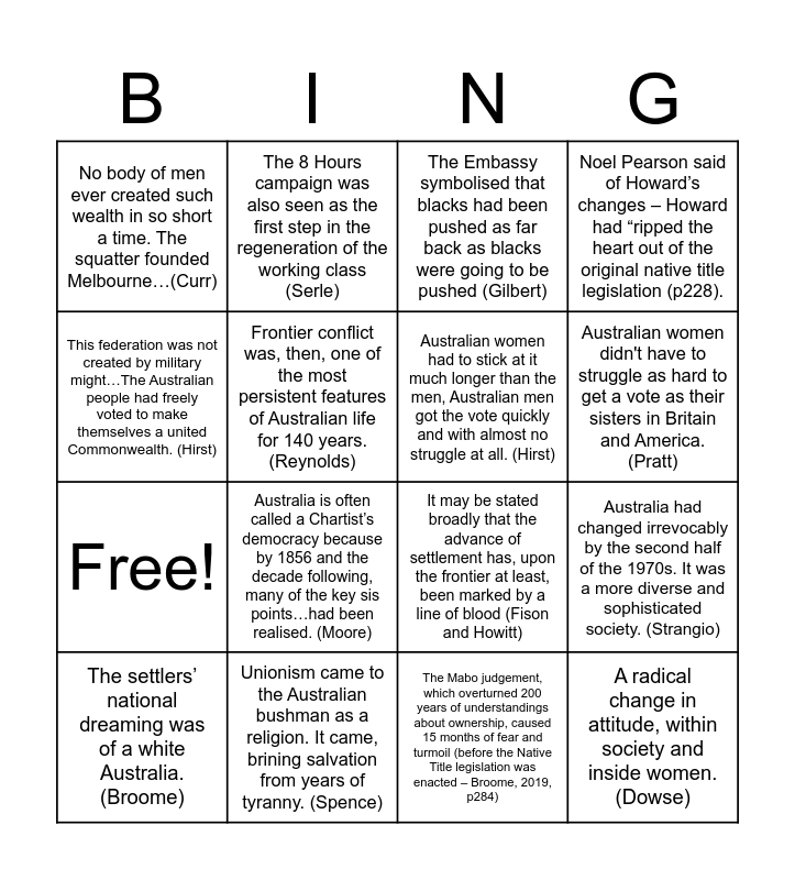 This bingo card has 20 words: Australia had changed irrevocably by the second half of the 1970s. It was a more diverse and sophisticated society. (Strangio), But WEL was not only shaping the political agenda, it was also transforming its members’ lives. (Sawer), The Embassy symbolised that blacks had been pushed as far back as blacks were going to be pushed (Gilbert), It was one of the most innovative and effective pieces of legislation of the period. (Lewis), The settlers’ national dreaming was of a white Australia. (Broome), This federation was not created by military might…The Australian people had freely voted to make themselves a united Commonwealth. (Hirst), Unionism came to the Australian bushman as a religion. It came, brining salvation from years of tyranny. (Spence), No body of men ever created such wealth in so short a time. The squatter founded Melbourne…(Curr), Free!, The 8 Hours campaign was also seen as the first step in the regeneration of the working class (Serle), Australia is often called a Chartist’s democracy because by 1856 and the decade following, many of the key sis points…had been realised. (Moore), It may be stated broadly that the advance of settlement has, upon the frontier at least, been marked by a line of blood (Fison and Howitt), Frontier conflict was, then, one of the most persistent features of Australian life for 140 years. (Reynolds), A radical change in attitude, within society and inside women. (Dowse), Australian women had to stick at it much longer than the men, Australian men got the vote quickly and with almost no struggle at all. (Hirst), Smooth the pillow of a dying race. (Pratt), Australian women didn't have to struggle as hard to get a vote as their sisters in Britain and America. (Pratt), Noel Pearson said of Howard’s changes – Howard had “ripped the heart out of the original native title legislation (p228)., The Mabo judgement, which overturned 200 years of understandings about ownership, caused 15 months of fear and turmoil (before the Native Title legislation was enacted – Broome, 2019, p284) and The petition did not change government actions…(after taking the mining company to court to try and stop them – they lost)…The judgement reaffirmed the doctrine of terra nullius. (Gordon, p 56).
