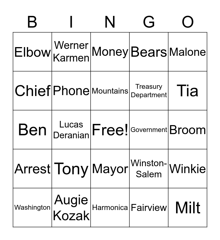 This bingo card has a free space and 24 words: Tony, Augie Kozak, Mountains, Washington, Malone, Elbow, Chief, Werner Karmen, Government, Mayor, Treasury Department, Ben, Winston- Salem, Winkie, Phone, Fairview, Broom, Money, Tia, Lucas Deranian, Milt, Arrest, Bears and Harmonica.