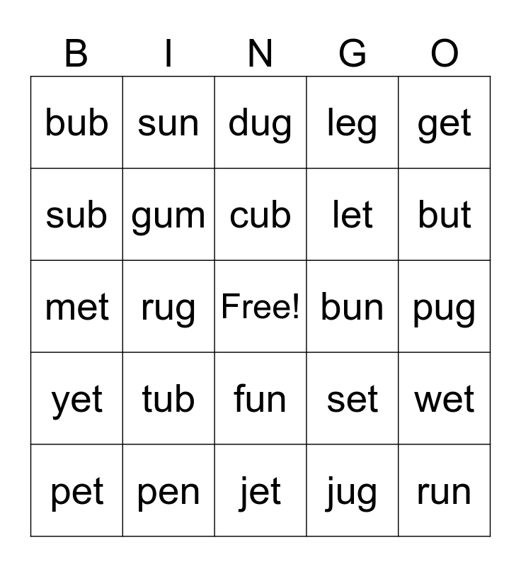 This bingo card has a free space and 24 words: tub, pen, cub, pet, get, bub, sub, sun, bun, fun, let, met, set, wet, gum, jug, pug, dug, but, rug, run, yet, leg and jet.