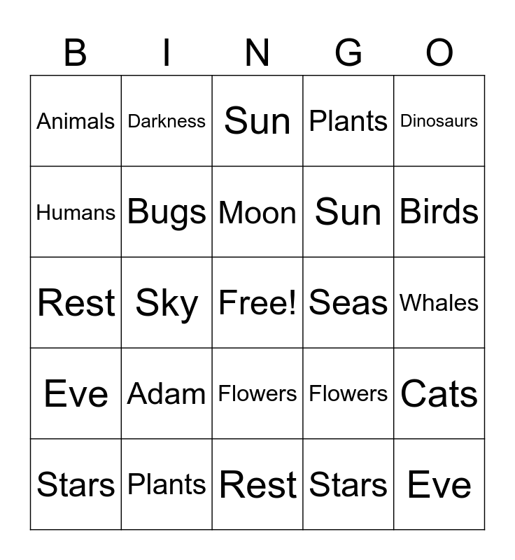 This bingo card has a free space and 72 words: Light, Darkness, Sky, Water, Land, Seas, Plants, Trees, Sun, Moon, Stars, Fish, Birds, Animals, Humans, Rest, Flowers, Dinosaurs, Bugs, Whales, Adam, Eve, Cats, Chickens, Light, Darkness, Sky, Water, Land, Seas, Plants, Trees, Sun, Moon, Stars, Fish, Birds, Animals, Humans, Rest, Flowers, Dinosaurs, Bugs, Whales, Adam, Eve, Cats, Chickens, Light, Darkness, Sky, Water, Land, Seas, Plants, Trees, Sun, Moon, Stars, Fish, Birds, Animals, Humans, Rest, Flowers, Dinosaurs, Bugs, Whales, Adam, Eve, Cats and Chickens.