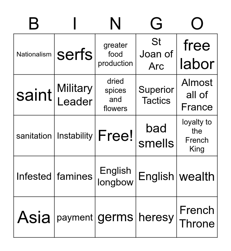 This bingo card has a free space and 24 words: famines, payment, dried spices and flowers, Asia, free labor, Nationalism, saint, serfs, bad smells, English longbow, Superior Tactics, sanitation, English, wealth, Military Leader, heresy, loyalty to the French King, greater food production, Almost all of France, Instability, French Throne, Infested, St Joan of Arc and germs.