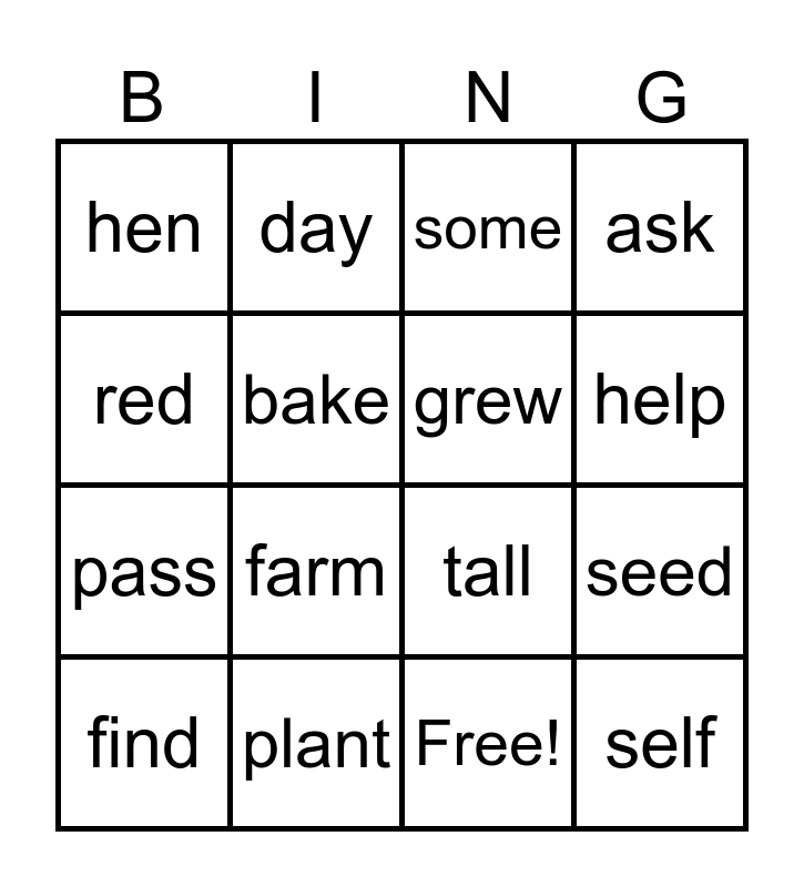 This bingo card has 17 words: Free!, find, some, hen, farm, ask, seed, grew, help, bake, plant, tall, red, day, pass, wheat and self.
