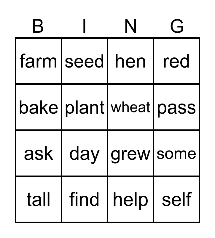 This bingo card has 16 words: find, some, hen, farm, ask, seed, grew, help, bake, plant, tall, red, day, pass, wheat and self.
