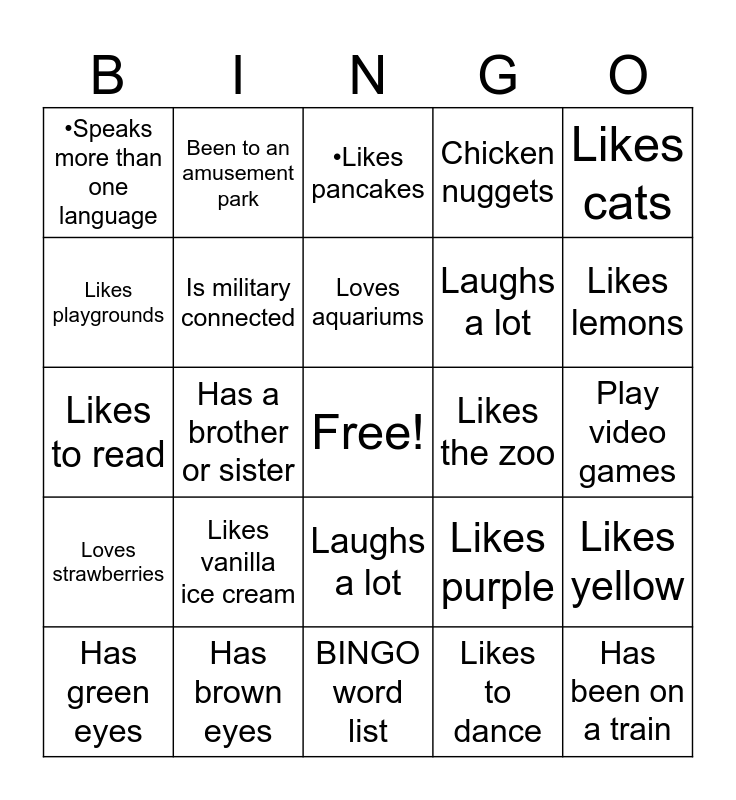 This bingo card has a free space and 31 words: BINGO word list, •Plays a sports, Has a brother or sister, likes a dog, •Speaks more than one language, •Likes pancakes, Is military connected, Likes purple, Likes the zoo, Likes to dance, Play video games, Has been on a train, Likes the beach, Born in Key West, Likes lemons, Enjoys coloring, Likes yellow, Likes vanilla ice cream, Loves strawberries, Laughs a lot, Likes cats, Likes snow, Has green eyes, Been to an amusement park, Laughs a lot, Likes playgrounds, Chicken nuggets, Likes to read, Has brown eyes, Loves aquariums and Likes chocolate ice cream.