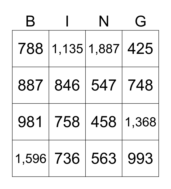 This bingo card has 28 words: 983, 875, 981, 247, 846, 1,887, 1,135, 993, 736, 856, 458, 425, 108, 610, 758, 1,258, 553, 547, 748, 877, 788, 1,435, 1,596, 1,368, 563, 228, 887 and 1,998.