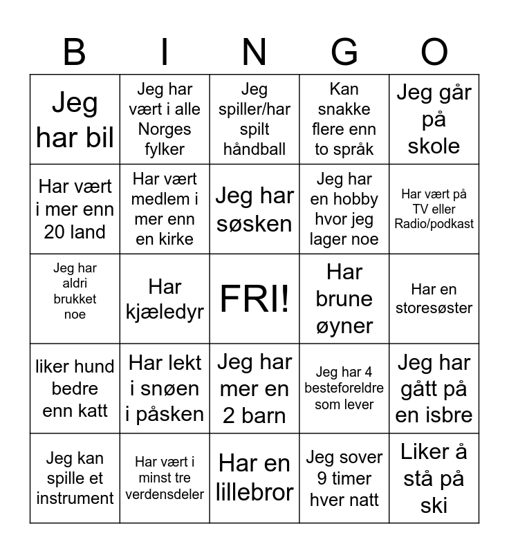 This bingo card has a free space and 24 words: Har lekt i snøen i påsken, Har vært i minst tre verdensdeler, Jeg har søsken, Jeg kan spille et instrument, Jeg går på skole, Jeg har bil, Har vært i mer enn 20 land, Jeg har vært i alle Norges fylker, Har brune øyner, Jeg har mer en 2 barn, Jeg har en hobby hvor jeg lager noe, Jeg har aldri brukket noe, Jeg har 4 besteforeldre som lever, Jeg har gått på en isbre, Har vært medlem i mer enn en kirke, Jeg sover 9 timer hver natt, Har en storesøster, Jeg spiller/har spilt håndball, Har vært på TV eller Radio/podkast, Har kjæledyr, Liker å stå på ski, liker hund bedre enn katt, Kan snakke flere enn to språk and Har en lillebror.