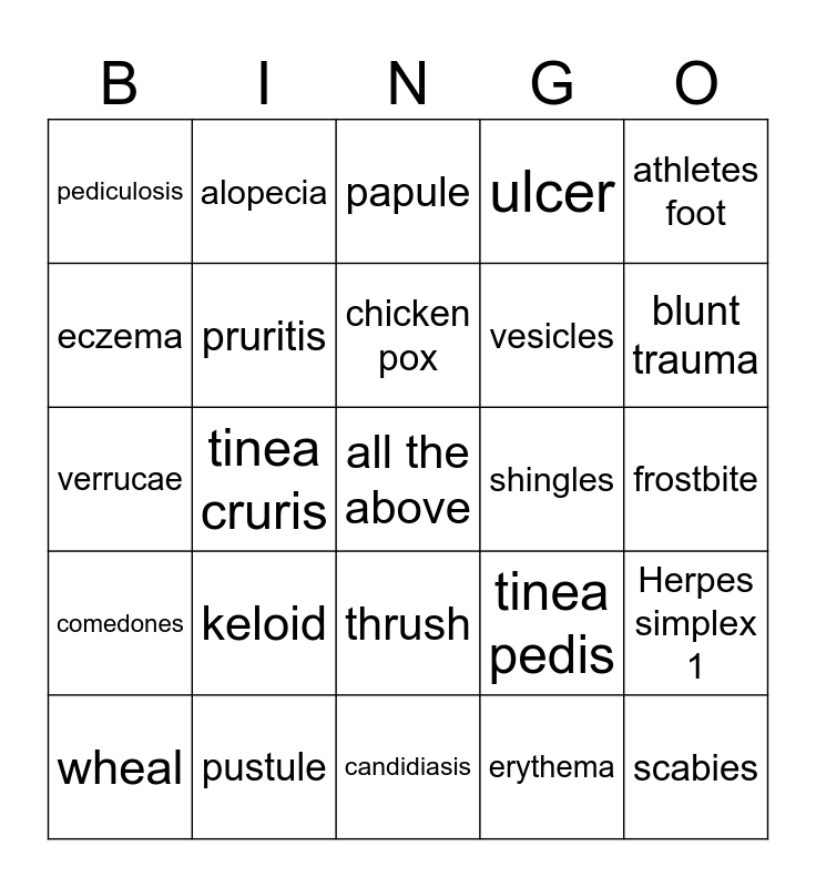 This bingo card has a free space and 59 words: macule, pustule, abrasion, comedones, erythema, lesion, pruritis, sebum, vesicles, keratin, ulcer, cradle cap, eczema, scleroderma, erysipelas, pediculosis, scabies, athletes foot, folliculitis, chicken pox, shingles, papule, wheal, Herpes simplex 1, pilonidal cyst, paronychia, laceration, avulsion, blunt trauma, pressure ulcer, hematoma, ephelis, nevus, hirsutism, alopecia, hemangioma, urticaria, tinea cruris, lice, verrucae, herpes simplex 2, keloid, frostbite, impetigo, plantar warts, abscess, MRSA, Lyme disease, thrush, candidiasis, tinea unguium, herpes, acne vulgaris, wart, bacteria, tinea pedis, fever blister / cold sore, true and false.