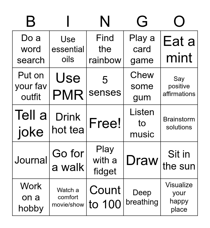 This bingo card has a free space and 31 words: Count to 100, Ride a bike, Drink hot tea, Splash face with cold water, Do a word search, Find the rainbow, Use PMR, Draw, Listen to music, Deep breathing, Brainstorm solutions, Visualize your happy place, Yoga, Talk to a friend, Say positive affirmations, Organize your space, Sit in the sun, Go for a walk, Journal, Play with a fidget, Eat a mint, Stretch, Work on a hobby, Use essential oils, Chew some gum, Put on your fav outfit, Play a card game, Tell a joke, Watch a comfort movie/show, 5 senses and Make a pros and cons list.