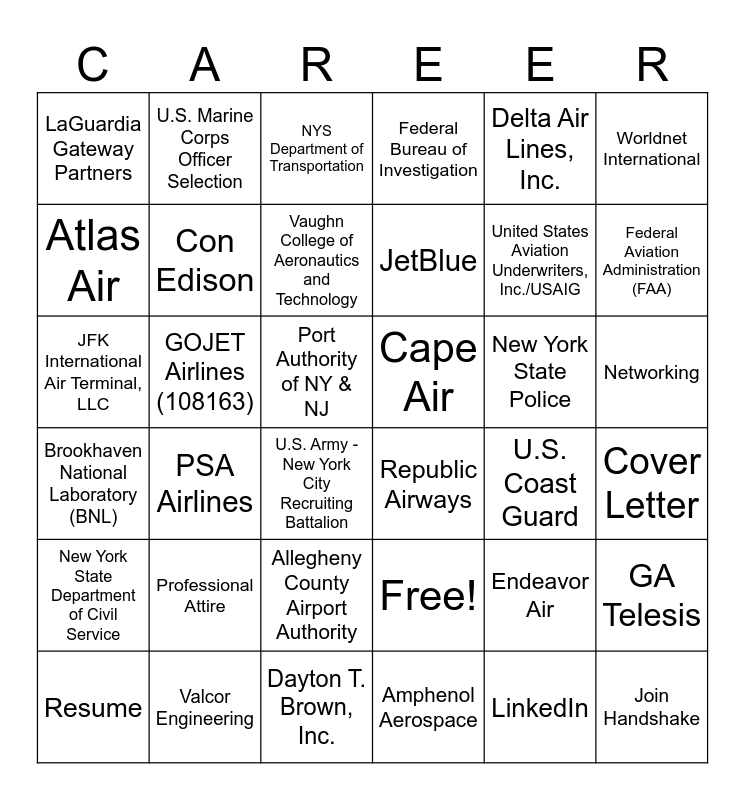 This bingo card has 36 words: Free!, Allegheny County Airport Authority, Amphenol Aerospace, Atlas Air, Brookhaven National Laboratory (BNL), Cape Air, Con Edison, Dayton T. Brown, Inc., Delta Air Lines, Inc., Endeavor Air, Federal Aviation Administration (FAA), Federal Bureau of Investigation, GA Telesis, GOJET Airlines (108163), JetBlue, LaGuardia Gateway Partners, New York State Department of Civil Service, New York State Police, JFK International Air Terminal, LLC, NYS Department of Transportation, Port Authority of NY & NJ, PSA Airlines, Republic Airways, U.S. Army - New York City Recruiting Battalion, U.S. Coast Guard, U.S. Marine Corps Officer Selection, United States Aviation Underwriters, Inc./USAIG, Valcor Engineering, Vaughn College of Aeronautics and Technology, Worldnet International, Join Handshake, Resume, Cover Letter, Networking, Professional Attire and LinkedIn.