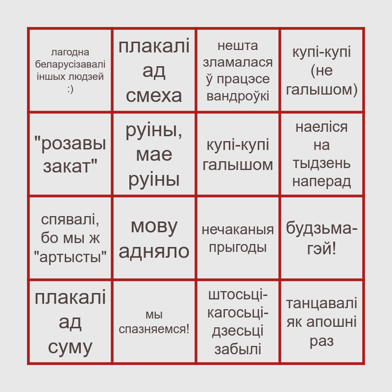 This bingo card has 16 words: мы спазняемся!, будзьма-гэй!, нешта зламалася ў працэсе вандроўкі, лагодна беларусізавалі іншых людзей :), спявалі, бо мы ж "артысты", плакалі ад смеха, нечаканыя прыгоды, штосьці-кагосьці-дзесьці забылі, "розавы закат", руіны, мае руіны, плакалі ад суму, купі-купі (не галышом), мову адняло, наеліся на тыдзень наперад, купі-купі галышом and танцавалі як апошні раз.