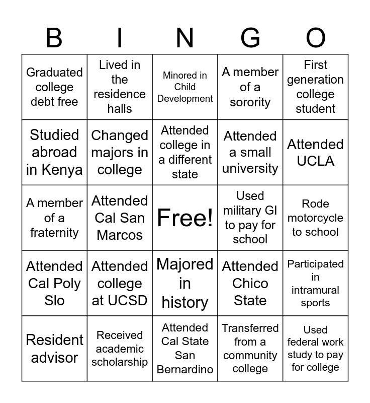 This bingo card has a free space and 24 words: Attended college at UCSD, Received academic scholarship, Attended college in a different state, Resident advisor, First generation college student, Graduated college debt free, Studied abroad in Kenya, Lived in the residence halls, Used military GI to pay for school, Majored in history, Attended a small university, A member of a fraternity, Attended Chico State, Participated in intramural sports, Changed majors in college, Transferred from a community college, Rode motorcycle to school, Minored in Child Development, Attended UCLA, Attended Cal San Marcos, Used federal work study to pay for college, Attended Cal Poly Slo, A member of a sorority and Attended Cal State San Bernardino.