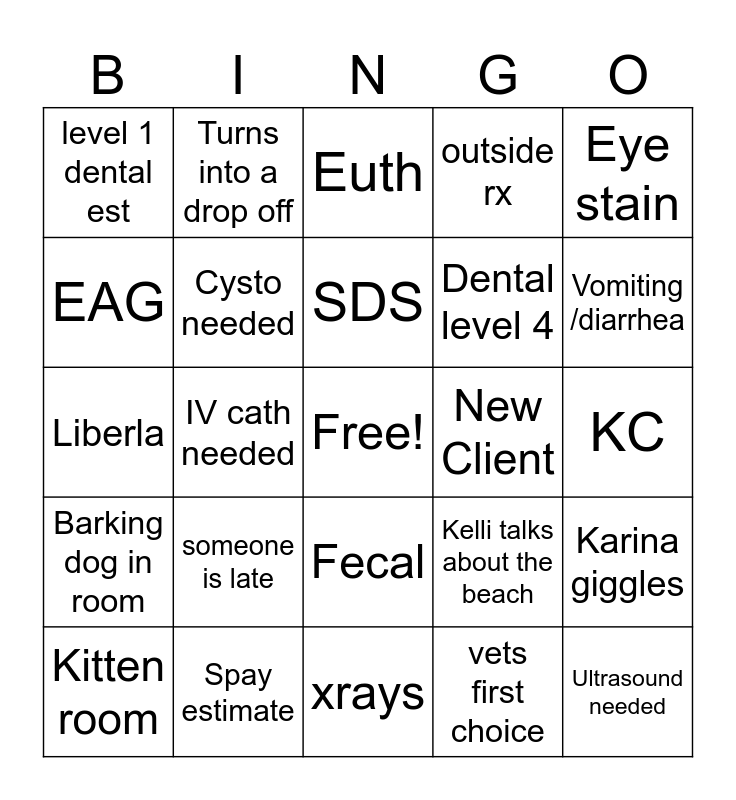 This bingo card has a free space and 48 words: Jr Wellness, Spay estimate, Two pet name, Vetsoria appt, Vomiting /diarrhea, check ears, Turns into a drop off, Muzzle, New Client, Yearly, EAG, Cysto needed, Senior bloodwork, Karina giggles, cerenia, Unplanned sx, Euth, Kelli talks about the beach, Check eye, level 1 dental est, someone is late, xrays, outside rx, Eye stain, cytopoint, IV cath needed, SDS, printer out of paper, KC, Barking dog in room, check skin, SQ Fluids, unvaccinated pet, EPOC, Kitten room, Felicia talks about Daughter, Drop off, vets first choice, Ultrasound needed, Tech Appt, RV only, Fecal, Dental level 4, Someone gets Wampy out, Liberla, Sydney asks to leave, Clipper are dead and Double room.