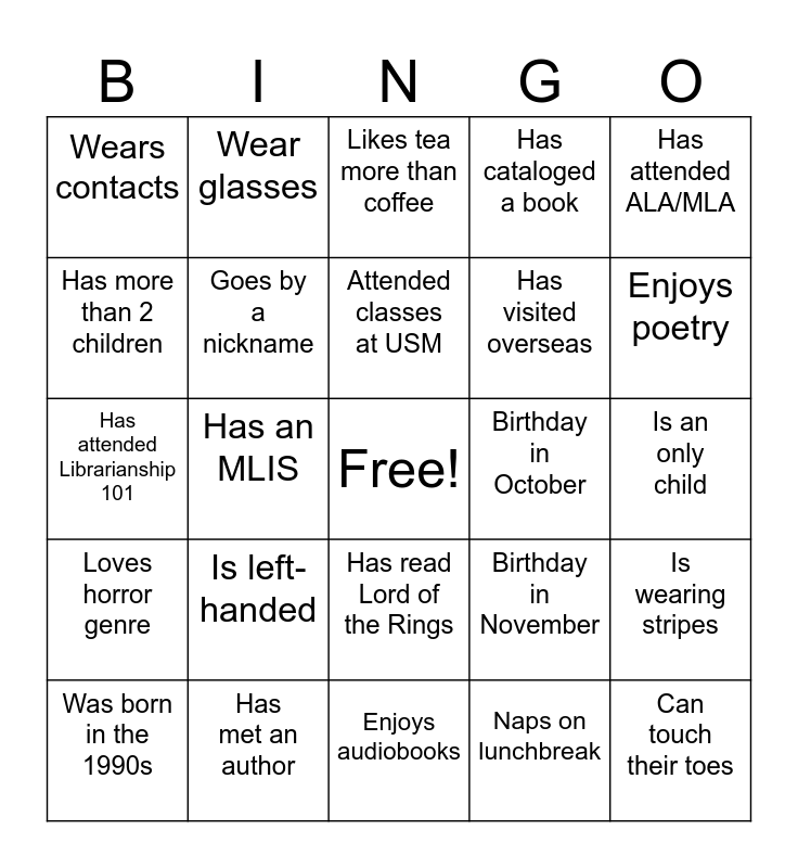 This bingo card has a free space and 29 words: Was born in the 1990s, Has led a storytime, Has an MLIS, Uses Android, Wears contacts, Likes tea more than coffee, Goes by a nickname, Is left-handed, Birthday in October, Has met an author, Is an only child, Can touch their toes, Enjoys audiobooks, Naps on lunchbreak, Enjoys poetry, Uses IPhone, Has read Lord of the Rings, Loves horror genre, Has attended ALA/MLA, Has attended Librarianship 101, Birthday in November, Has a cat, Has visited overseas, Has more than 2 children, Has cataloged a book, Wear glasses, Is wearing stripes, Attended classes at USM and Runs a book club.
