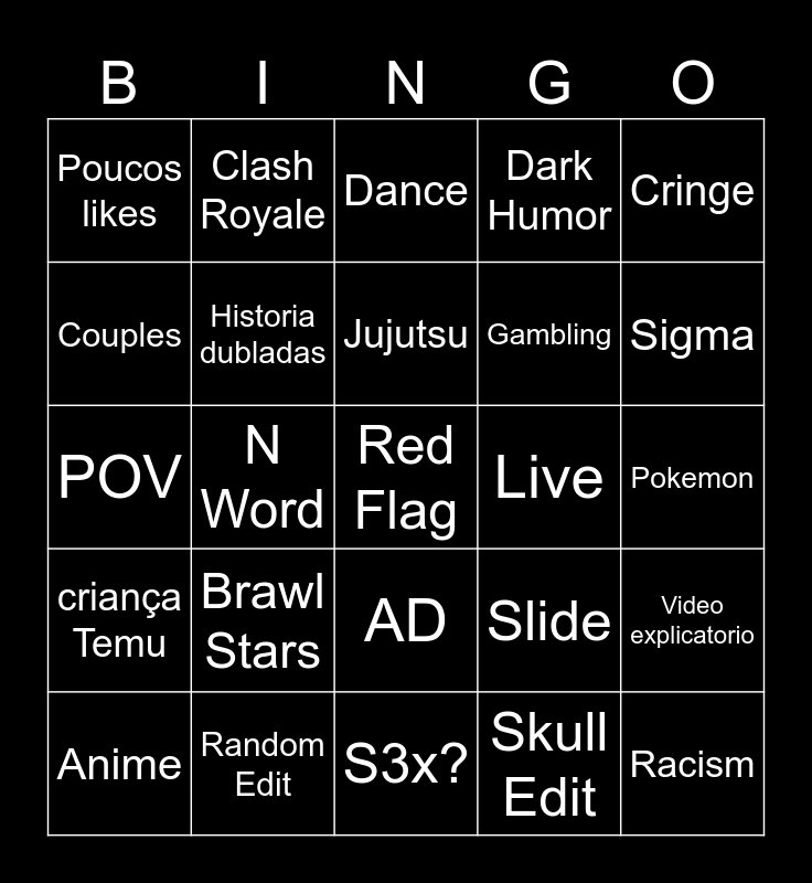 This bingo card has a free space and 24 words: Brawl Stars, Random Edit, Jujutsu, Anime, Cringe, Poucos likes, Couples, Clash Royale, Live, AD, Gambling, POV, Slide, Video explicatorio, Historia dubladas, Skull Edit, Pokemon, Dance, Sigma, N Word, Racism, criança Temu, Dark Humor and S3x?.
