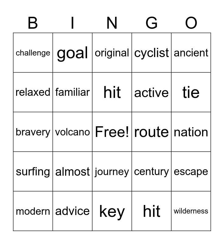 This bingo card has a free space and 24 words: almost, advice, hit, modern, ancient, challenge, relaxed, goal, route, journey, active, bravery, century, escape, familiar, hit, nation, original, tie, volcano, wilderness, surfing, cyclist and key.
