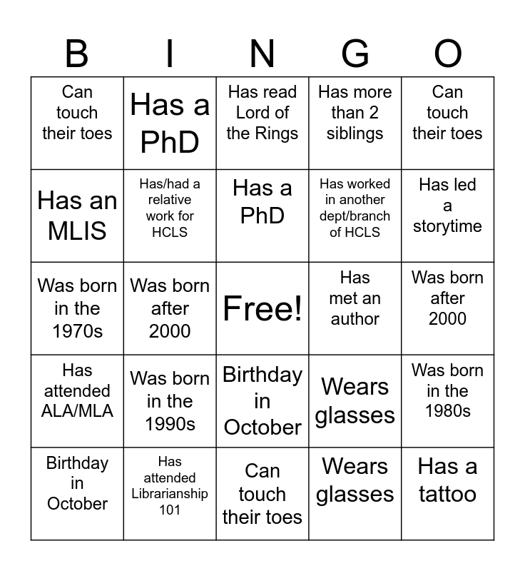This bingo card has a free space and 58 words: Is wearing polka dots, Has attended Librarianship 101, Attended classes at USM, Has attended ALA/MLA, Wears glasses, Loves horror genre, Has/had a relative work for HCLS, Enjoys poetry, Has worked in another dept/branch of HCLS, Naps on lunchbreak, Has more than 2 siblings, Enjoys audiobooks, Worked at HCLS for less than 1 year, Has a birthday in November, Has cataloged a book, Can touch their toes, Has a tattoo, Can touch their toes, Is an only child, Has a PhD, Has met an author, Has read Lord of the Rings, Birthday in October, Was born in the 1980s, Was born in the 1970s, Was born after 2000, Worked at HCLS for less than 1 year, Likes tea more than coffee, Has led a storytime, Loves horror genre, Naps on lunchbreak, Owns a truck, Plays a musical instrument, Runs a book club, Speaks a language other than English, Uses Android, Uses IPhone, Was born after 2000, Was born in the 1970s, Was born in the 1980s, Was born in the 1990s, Wears contacts, Wears glasses, Worked at HCLS for 20+ years, Worked at HCLS for less than 1 year, Attended classes at USM, Birthday in November, Birthday in October, Can touch their toes, Enjoys audiobooks, Enjoys poetry, Goes by a nickname, Has a cat, Has a dog, Has a PhD, Has a tattoo, Has an MLIS and Has attended ALA/MLA.