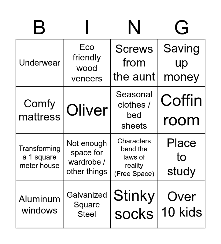 This bingo card has 21 words: Galvanized Square Steel, Normal wood veneers, Eco friendly wood veneers, Projector to watch korean dramas, Stinky socks, Seasonal clothes / bed sheets, Underwear, Screws from the aunt, Characters bend the laws of reality (Free Space), Coffin room, Transforming a 1 square meter house, Saving up money, Over 10 kids, Borrowing space from their neighbours, Oliver, Normal square steel, Aluminum windows, Not enough space for wardrobe / other things, Comfy mattress, Place to study and Secret rooms.