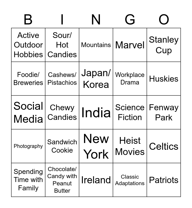 This bingo card has 67 words: Watching Sports, Swiss Chocolate, West Coast, Classic Adaptations, Celtics, Playing Sports, Sour/ Hot Candies, Theme Parks, Workplace Drama, Warriors, Spending Time with Family, Movie Theater Candy, New York, Marvel, SunRisers Hyderabad, Foodie/ Breweries, Chewy Candies, Mountains, Epic Fantasy, Stanley Cup, Photography, Sandwich Cookie, Japan/ Korea, Small Town Setting, Mumbai Indians, Travel, Gummies and Jellies, Italy, Science Fiction, New York, Social Media, Chocolate Bars, Island/ Beach, Michael Schur Shows, Patriots, Reading, Hard Candy, Ireland, Heist Movies, Huskies, Niche Hobbies, Cashews/ Pistachios, India, Game of Thrones, Kelce Brothers, Music/ Concerts, Chocolate/ Candy with Almonds or Peanuts, Hawaii, Friends, Fenway Park, Active Outdoor Hobbies, Doesn't Like Sweets, Florida, Feel-Good Movies, Eli Manning, Gaming, Chocolate/ Candy with Peanut Butter, Germany, Competition Show, Does Not Like Sports, Arts & Crafts, Chocolate/ Candy with Caramel, Alaska, Bryan Cranston, Drew Bledsoe, Crime/ Thriller Dramas and Celtics.