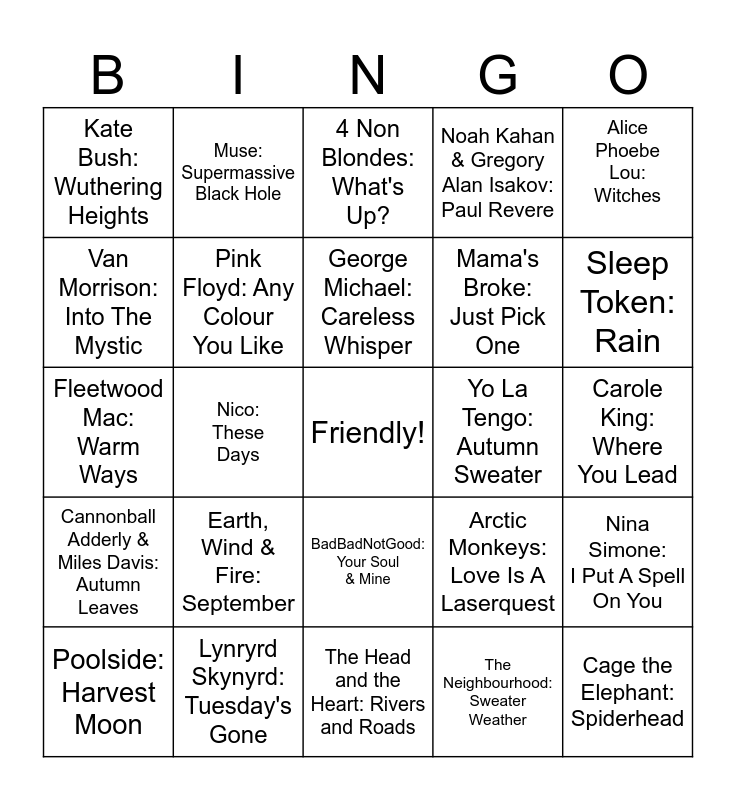 This bingo card has a free space and 30 words: Serge Gainsbourg: La chanson de Prevert, Lynryrd Skynyrd: Tuesday's Gone, 4 Non Blondes: What's Up?, Clairo: Bags, Alice Phoebe Lou: Witches, Kate Bush: Wuthering Heights, Pink Floyd: Any Colour You Like, George Michael: Careless Whisper, Mama's Broke: Just Pick One, Cage the Elephant: Spiderhead, Poolside: Harvest Moon, Earth, Wind & Fire: September, The Neighbourhood: Sweater Weather, Lana Del Ray: Season of the Witch, Cannonball Adderly & Miles Davis: Autumn Leaves, The Kinks: Autumn Almanac, The Head and the Heart: Rivers and Roads, Yo La Tengo: Autumn Sweater, Nina Simone: I Put A Spell On You, Van Morrison: Into The Mystic, Nico: These Days, The Decemberists: Don't Carry It All, Noah Kahan & Gregory Alan Isakov: Paul Revere, Carole King: Where You Lead, Fleetwood Mac: Warm Ways, Muse: Supermassive Black Hole, BadBadNotGood: Your Soul & Mine, Arctic Monkeys: Love Is A Laserquest, Sleep Token: Rain and Foushee: Still Around (visualizer).