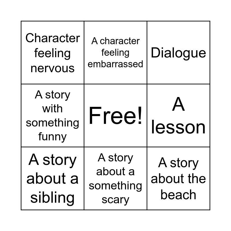 This bingo card has a free space and 20 words: A great simile, a great metaphor, Dialogue, A great lead, A good verb, A story about the beach, A story about school, Character feeling nervous, A character feeling anxious, A character feeling embarrassed, A character feeling afraid, A character feeling excited, A lesson, A story about vacation, A story about a sibling, A story with an animal, A story about a something scary, A story with something funny, A spelling error and A punctuation error.