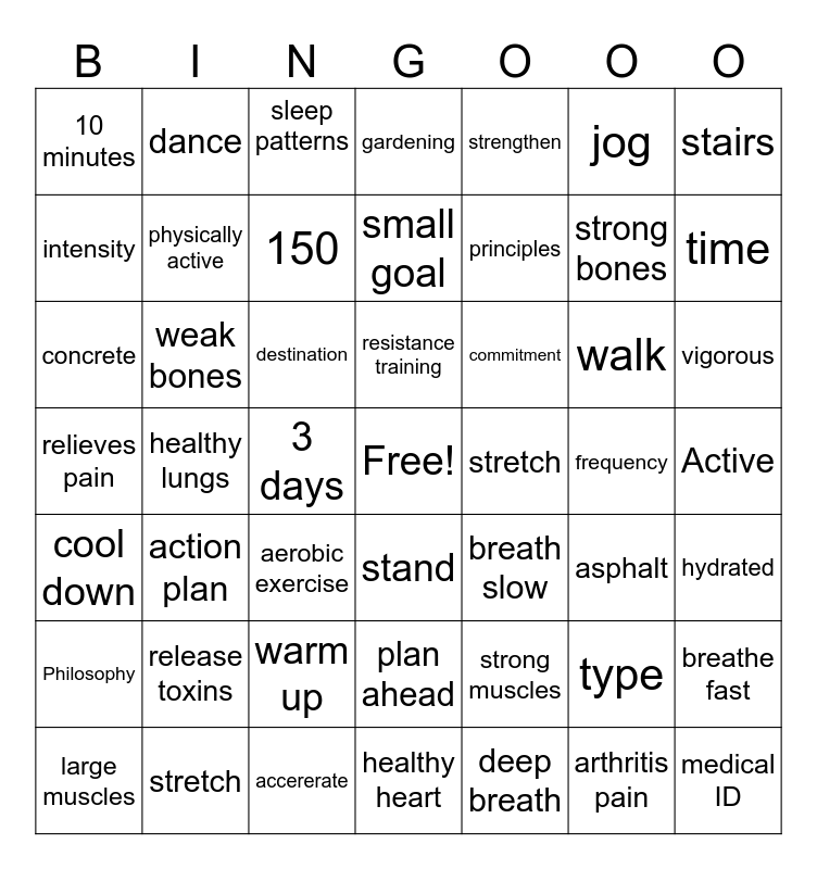 This bingo card has a free space and 48 words: strong muscles, strong bones, healthy heart, healthy lungs, destination, Active, dance, stretch, jog, stand, stairs, gardening, walk, commitment, Philosophy, frequency, intensity, time, type, strengthen, principles, 3 days, 10 minutes, physically active, breathe fast, 150, vigorous, large muscles, resistance training, weak bones, arthritis pain, stretch, hydrated, release toxins, relieves pain, breath slow, asphalt, concrete, aerobic exercise, warm up, cool down, medical ID, sleep patterns, accererate, small goal, plan ahead, action plan and deep breath.