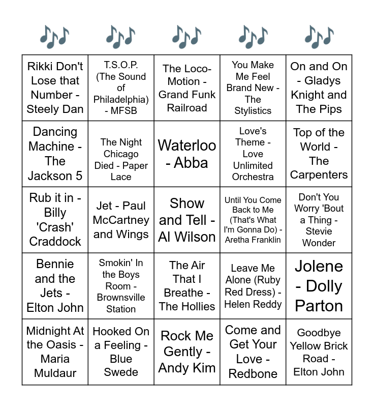 This bingo card has a free space and 28 words: Jolene - Dolly Parton, Seasons In the Sun - Terry Jacks, Love's Theme - Love Unlimited Orchestra, Come and Get Your Love - Redbone, Dancing Machine - The Jackson 5, The Loco-Motion - Grand Funk Railroad, T.S.O.P. (The Sound of Philadelphia) - MFSB, Bennie and the Jets - Elton John, Until You Come Back to Me (That's What I'm Gonna Do) - Aretha Franklin, Midnight At the Oasis - Maria Muldaur, Rub it in -Billy 'Crash' Craddock, You Make Me Feel Brand New - The Stylistics, Hooked On a Feeling - Blue Swede, Rock Me Gently - Andy Kim, Top of the World - The Carpenters, Rock the Boat - The Hues Corporation, Smokin' In the Boys Room - Brownsville Station, The Night Chicago Died - Paper Lace, Waterloo - Abba, The Air That I Breathe - The Hollies, Rikki Don't Lose that Number - Steely Dan, Takin' Care of Business - Bachman-Turner Overdrive, Goodbye Yellow Brick Road - Elton John, Jet - Paul McCartney and Wings, Don't You Worry 'Bout a Thing - Stevie Wonder, Leave Me Alone (Ruby Red Dress) - Helen Reddy, On and On - Gladys Knight and The Pips and Mockingbird - Carly Simon and James Taylor.