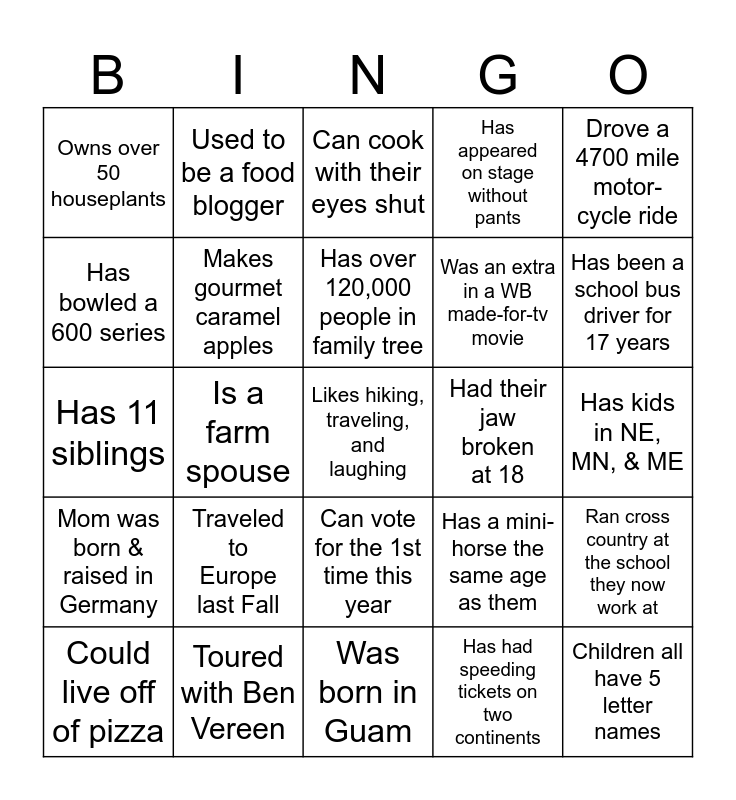 This bingo card has a free space and 31 words: Was born in Guam, Has 3 sons but was only pregnant twice, Is a farm spouse, Has an original Hannah Montana script, Owns over 50 houseplants, Can cook with their eyes shut, Makes gourmet caramel apples, Has a mini-horse the same age as them, Had their jaw broken at 18, Has had speeding tickets on two continents, Has kids in NE, MN, & ME, Children all have 5 letter names, Was a cheerleader in high school, Name means "I love you" in Mayan, Has been a school bus driver for 17 years, Was a Chicagoland dance instructor/choreographer, Ran cross country at the school they now work at, Traveled to Europe last Fall, Mom was born & raised in Germany, Can vote for the 1st time this year, Drove a 4700 mile motor-cycle ride, Spent a summer learning the ukulele, Could live off of pizza, Used to be a food blogger, Was an extra in a WB made-for-tv movie, Has bowled a 600 series, Has appeared on stage without pants, Has 11 siblings, Toured with Ben Vereen, Has over 120,000 people in family tree and Family held an annual bull riding tournament.