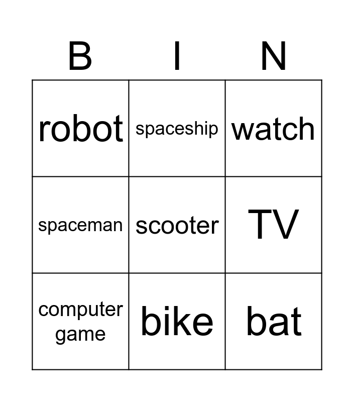 This bingo card has a free space and 8 words: TV, watch, spaceship, computer game, robot, bat, spaceman and bike.