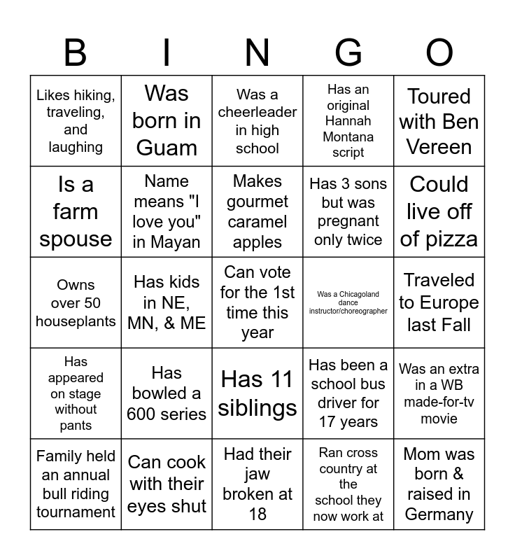 This bingo card has a free space and 31 words: Had their jaw broken at 18, Has had speeding tickets on two continents, Has kids in NE, MN, & ME, Children all have 5 letter names, Likes hiking, traveling, and laughing, Was a cheerleader in high school, Name means "I love you" in Mayan, Has been a school bus driver for 17 years, Was a Chicagoland dance instructor/choreographer, Ran cross country at the school they now work at, Traveled to Europe last Fall, Mom was born & raised in Germany, Drove a 4700 mile motor-cycle ride, Spent a summer learning the ukulele, Could live off of pizza, Used to be a food blogger, Was an extra in a WB made-for-tv movie, Has bowled a 600 series, Has appeared on stage without pants, Has 11 siblings, Toured with Ben Vereen, Has over 120,000 people in family tree, Family held an annual bull riding tournament, Was born in Guam, Has 3 sons but was pregnant only twice, Is a farm spouse, Has an original Hannah Montana script, Owns over 50 houseplants, Can cook with their eyes shut, Makes gourmet caramel apples and Has a mini-horse the same age as them.