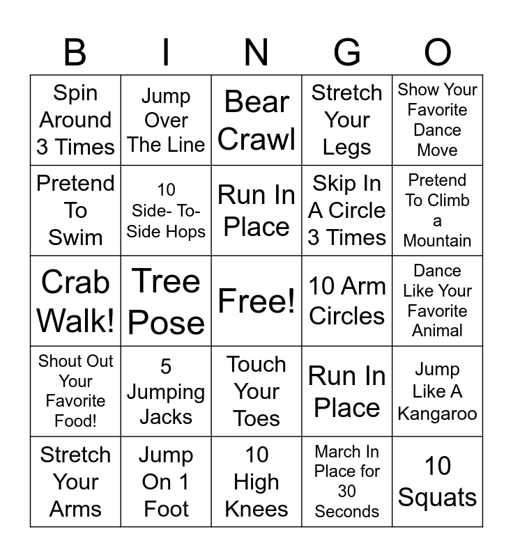 This bingo card has a free space and 24 words: 5 Jumping Jacks, Jump On 1 Foot, Run In Place, Stretch Your Arms, Show Your Favorite Dance Move, Spin Around 3 Times, Pretend To Swim, Jump Over The Line, 10 Arm Circles, Touch Your Toes, Skip In A Circle 3 Times, Crab Walk!, Run In Place, Jump Like A Kangaroo, 10 Side- To- Side Hops, March In Place for 30 Seconds, Dance Like Your Favorite Animal, Bear Crawl, Pretend To Climb a Mountain, Tree Pose, 10 Squats, Shout Out Your Favorite Food!, Stretch Your Legs and 10 High Knees.