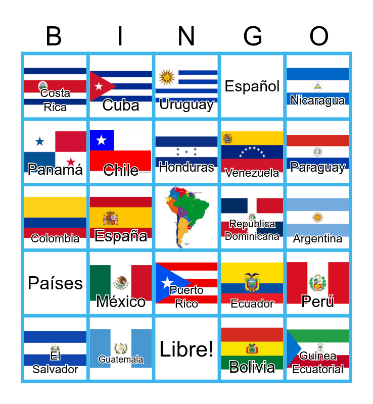 This bingo card has 21 images, a free space and 24 words: México, Guatemala, Honduras, El Salvador, Nicaragua, Costa Rica, Panamá, Cuba, República Dominicana, Puerto Rico, Venezuela, Colombia, Ecuador, Perú, Chile, Bolivia, Argentina, Uruguay, Paraguay, España, Guinea Ecuatorial, Países, Español and Libre!.