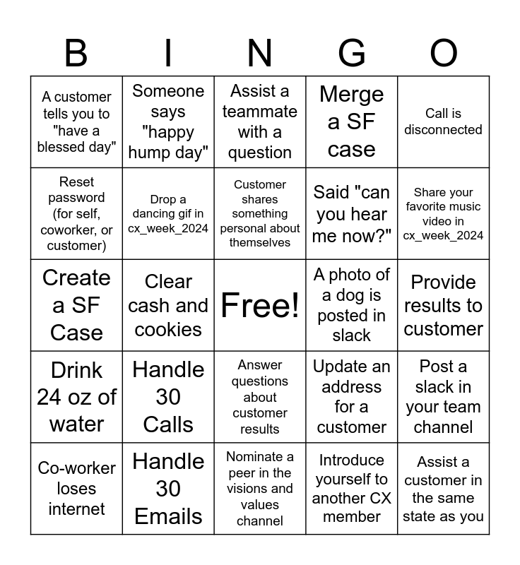 This bingo card has a free space and 24 words: Handle 30 Calls, Handle 30 Emails, Customer shares something personal about themselves, Co-worker loses internet, Call is disconnected, A customer tells you to "have a blessed day", Reset password (for self, coworker, or customer), Someone says "happy hump day", A photo of a dog is posted in slack, Answer questions about customer results, Said "can you hear me now?", Create a SF Case, Update an address for a customer, Post a slack in your team channel, Drop a dancing gif in cx_week_2024, Introduce yourself to another CX member, Provide results to customer, Assist a teammate with a question, Share your favorite music video in cx_week_2024, Clear cash and cookies, Assist a customer in the same state as you, Drink 24 oz of water, Merge a SF case and Nominate a peer in the visions and values channel.