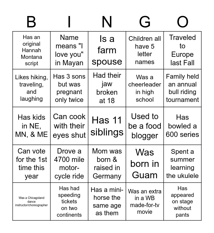 This bingo card has a free space and 31 words: Has a mini-horse the same age as them, Makes gourmet caramel apples, Can cook with their eyes shut, Owns over 50 houseplants, Has an original Hannah Montana script, Is a farm spouse, Has 3 sons but was pregnant only twice, Was born in Guam, Used to be a food blogger, Was an extra in a WB made-for-tv movie, Has bowled a 600 series, Has appeared on stage without pants, Toured with Ben Vereen, Has over 120,000 people in family tree, Family held an annual bull riding tournament, Could live off of pizza, Spent a summer learning the ukulele, Drove a 4700 mile motor-cycle ride, Can vote for the 1st time this year, Mom was born & raised in Germany, Traveled to Europe last Fall, Ran cross country at the school they now work at, Was a Chicagoland dance instructor/choreographer, Name means "I love you" in Mayan, Was a cheerleader in high school, Likes hiking, traveling, and laughing, Children all have 5 letter names, Has kids in NE, MN, & ME, Has had speeding tickets on two continents, Had their jaw broken at 18 and Has been a school bus driver for 17 years.