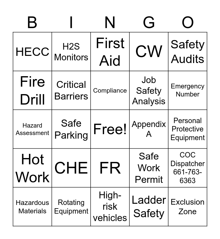 This bingo card has a free space and 24 words: CHE, Rotating Equipment, Compliance, Hazardous Materials, Safety Audits, HECC, Fire Drill, H2S Monitors, Appendix A, FR, Job Safety Analysis, Hazard Assessment, Safe Work Permit, COC Dispatcher 661-763-6363, Critical Barriers, Ladder Safety, Personal Protective Equipment, First Aid, Emergency Number, Safe Parking, Exclusion Zone, Hot Work, CW and High-risk vehicles.
