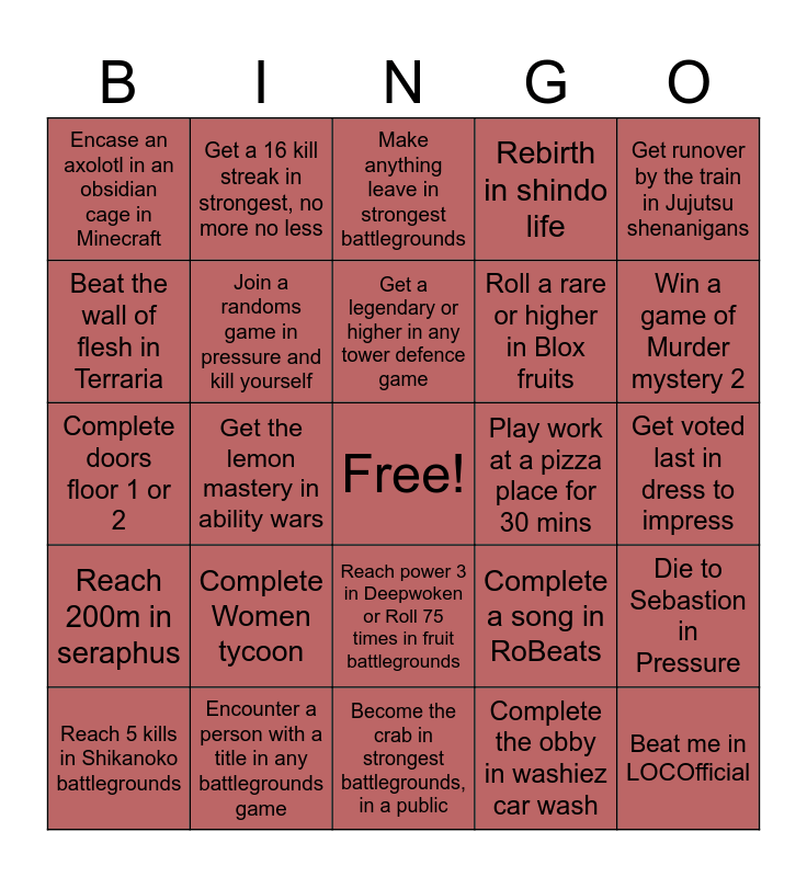 This bingo card has a free space and 24 words: Complete Women tycoon, Encounter a person with a title in any battlegrounds game, Get a legendary or higher in any tower defence game, Reach 5 kills in Shikanoko battlegrounds, Get runover by the train in Jujutsu shenanigans, Encase an axolotl in an obsidian cage in Minecraft, Beat the wall of flesh in Terraria, Get a 16 kill streak in strongest, no more no less, Play work at a pizza place for 30 mins, Reach power 3 in Deepwoken or Roll 75 times in fruit battlegrounds, Roll a rare or higher in Blox fruits, Complete doors floor 1 or 2, Complete a song in RoBeats, Die to Sebastion in Pressure, Join a randoms game in pressure and kill yourself, Complete the obby in washiez car wash, Get voted last in dress to impress, Make anything leave in strongest battlegrounds, Win a game of Murder mystery 2, Get the lemon mastery in ability wars, Beat me in LOCOfficial, Reach 200m in seraphus, Rebirth in shindo life and Become the crab in strongest battlegrounds, in a public.