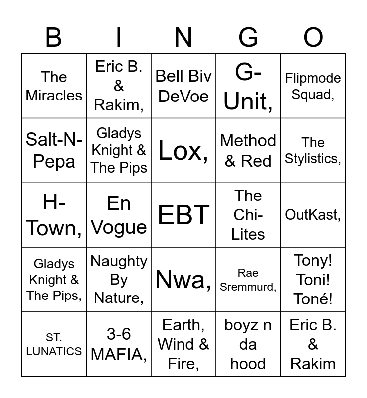 This bingo card has a free space and 84 words: Fugees, Naughty By Nature, Bell Biv DeVoe, De La Soul, A Tribe Called Quest, Run-D.M.C., 702, The Gap Band, Earth, Wind & Fire, Harold Melvin & The Blue Notes, Xscape, The Stylistics, Gladys Knight & The Pips, The Chi-Lites, Ohio Players, The Miracles, ST. LUNATICS, Salt-N-Pepa, The Beatnuts, Dead Prez, Clipse, Method & Red, Eric B. & Rakim, SWV, En Vogue, K. K-Ci & JoJo, EPMD, OutKast, Jackson 5, Isley Brothers., Naughty By Nature,, pretty ricky, Bell Biv DeVoe,, H-Town,, Run-D.M.C.,, The Gap Band,, Earth, Wind & Fire,, Xscape,, The Stylistics,, Gladys Knight & The Pips,, The Chi-Lites,, The Miracles,, Wu-Tang Clan,, Migos,, Salt-N-Pepa,, Clipse,, Eric B. & Rakim,, SWV,, En Vogue,, K-Ci & JoJo,, Goodie Mob,, Rae Sremmurd,, G-Unit,, THE carters,, Bone Thugs,, Destiny's Child,, 3-6 MAFIA,, Lox,, 112,, OutKast,, Big Tymers, Total,, hot boyz,, Blackstreet,, jagged edge, Fugees,, D12,, Geto Boys,, Flipmode Squad,, B2K,, Tony! Toni! Toné!, The Whispers,, Ying Yang Twins, ruff ryders,, Nwa,, boyz n da hood, no limit soldier, bell biv devoe,, Terror Squad.,, Temptations, Supremes,, New Edition,, TLC, and Jodeci,.