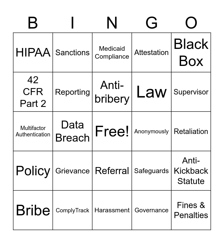 This bingo card has a free space and 73 words: Integrity, Transparency, HIPAA, Whistleblower, Fraud, Audit, Policy, Ethics, Safeguards, Consent, Training, Oversight, Reporting, Retaliation, Privacy, Sanctions, Harassment, 42 CFR Part 2, Accountable, Anonymously, Anti-bribery, Attestation, Black Box, Blame, Bribe, Business Associate, Code of Conduct, Compliance Hotline, Compliance Training, Compliant, ComplyTrack, Confidentiality, Conflict of Interest, Cybersecurity, Data Breach, Disclosure, Encrypt, EthicsPoint, Fines & Penalties, FraudWasteAbuse, Governance, Grievance, HIM, Incident Reporting, Kickback, Law, Medicaid Compliance, Minimum Necessary, MOU, Multifactor Authentication, NavexOne, OSHA, PHI, Phishing, Policies and Procedures, Privacy Rule, Qui Tam, Referral, Reporting Mechanism, Risk, Risk Assessment, ROI, Subpoena, Supervisor, TPO, OIG, CMS, Stark Law, Anti-Kickback Statute, CAP, Compliance & Ethics Committee, Noncompliance and IGR Committee.