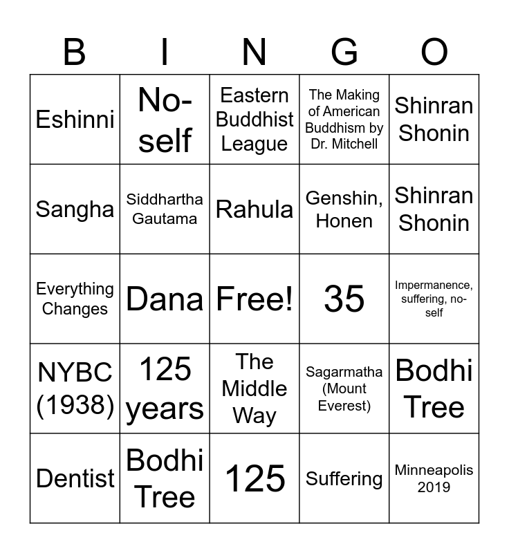 ⚠ This card has duplicate items: Nirvana (2), Nepal (2), Sagarmatha (Mount Everest) (2), Bodhi Tree (2), Suffering (2), No-self (2), Siddhartha Gautama (2), Rahula (2), 35 (2), The Middle Way (2), Greed, hatred, ignorance (2), Impermanence, suffering, no-self (2), Shinran Shonin (2), Sangha (2), Dana (2), Eshinni (2), Kakushinni (2), Genshin, Honen (2), NYBC (1938) (2), The Making of American Buddhism by Dr. Mitchell (2), 7 (2), Eastern Buddhist League (2), To listen to the Dharma (2), Rev. Kurt Rye (2), Rev. Ron Miyamura (2), Minneapolis 2019 (2), Fukuoka (2), Dentist (2), Buddhist Temple of San Diego (2)