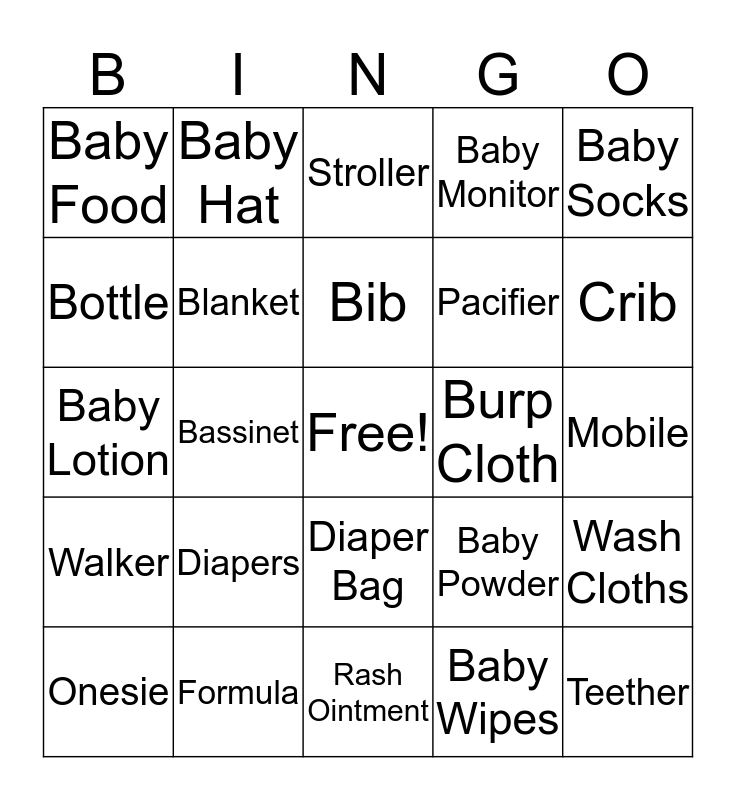 This bingo card has a free space and 24 words: Diapers, Formula, Bib, Onesie, Baby Socks, Baby Food, Bottle, Baby Hat, Burp Cloth, Diaper Bag, Pacifier, Baby Lotion, Baby Powder, Wash Cloths, Blanket, Baby Wipes, Mobile, Stroller, Crib, Bassinet, Teether, Walker, Baby Monitor and Rash Ointment.