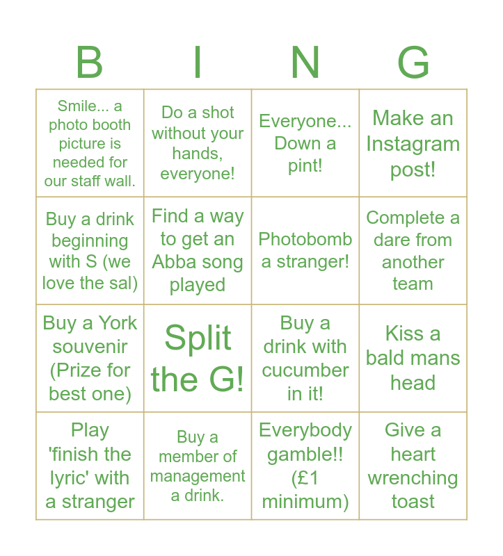 This bingo card has 16 words: Buy a member of management a drink., Kiss a bald mans head, Everyone... Down a pint!, Smile... a photo booth picture is needed for our staff wall., Buy a York souvenir (Prize for best one), Do a shot without your hands, everyone!, Buy a drink with cucumber in it!, Everybody gamble!! (£1 minimum), Buy a drink beginning with S (we love the sal), Find a way to get an Abba song played, Play 'finish the lyric' with a stranger, Make an Instagram post!, Split the G!, Complete a dare from another team, Photobomb a stranger! and Give a heart wrenching toast.