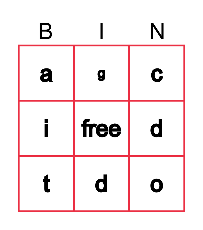 This bingo card has a free space and 9 words: t, c, g, i, a, d, o, m and d.