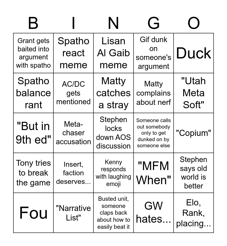 This bingo card has 28 words: Stephen says old world is better, DG is really 3 armies, Matty complains about nerf, GW hates..., Spatho balance rant, Lisan Al Gaib meme, Spatho react meme, Tony tries to break the game, Someone calls out somebody only to get dunked on by someone else, Fou, "But in 9th ed", Gif dunk on someone's argument, "Narrative List", Busted unit, someone claps back about how to easily beat it, "Utah Meta Soft", "Non-Utah Meta Soft", Insert, faction deserves..., AC/DC gets mentioned, Matty catches a stray, Kenny responds with laughing emoji, Grant gets baited into argument with spatho, Elo, Rank, placing..., Stephen locks down AOS discussion, Meta-chaser accusation, "Copium", "MFM When", Duck and Secret Missions Complaint.