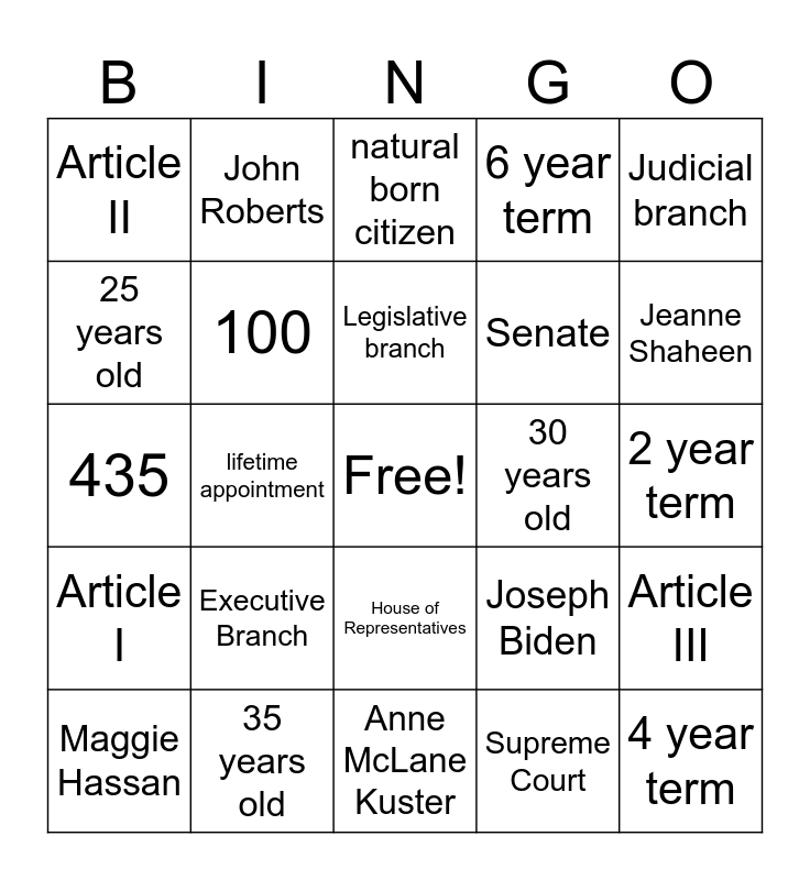 This bingo card has a free space and 24 words: Executive Branch, 35 years old, Legislative branch, Maggie Hassan, Judicial branch, Article II, 25 years old, John Roberts, 30 years old, House of Representatives, Senate, 435, Joseph Biden, Article III, 100, Supreme Court, 2 year term, natural born citizen, Jeanne Shaheen, lifetime appointment, 4 year term, Article I, 6 year term and Anne McLane Kuster.