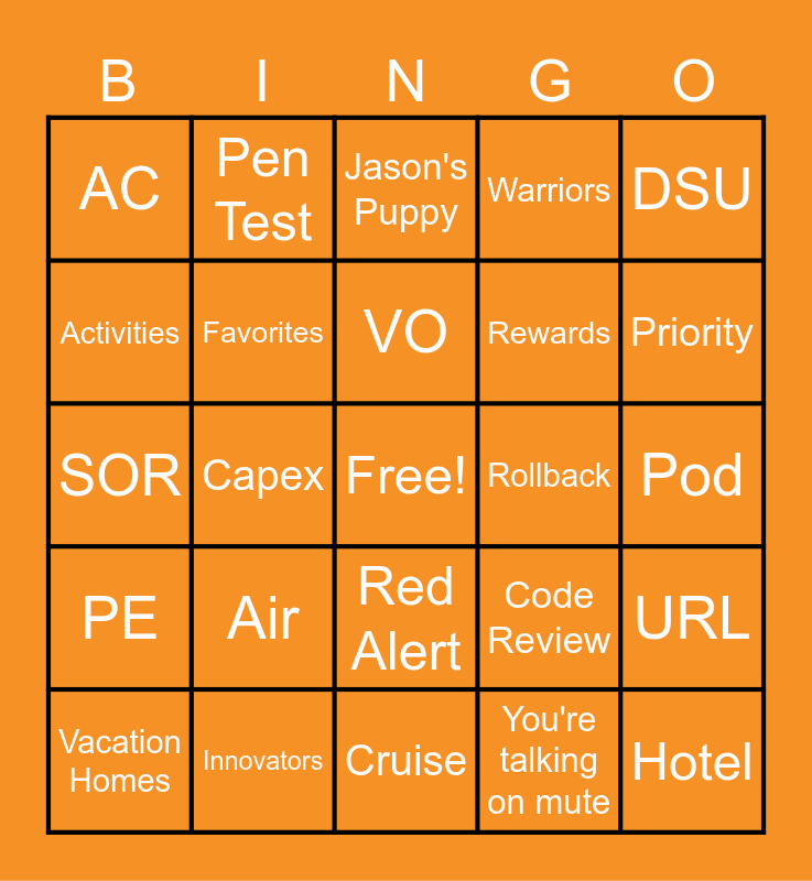 This bingo card has a free space and 44 words: Joke, Hotel, Resort, Vacation Homes, ARDA, You're talking on mute, Jason's Puppy, Coffee, DSU, Innovators, Warriors, Rollback, Red Alert, Air, Car, Cruise, VRBO, SOR, Defect, Priority, Pen Test, QA, Test Case, AC, Mob, Pod, PTO, PR, Code Review, PE, Wiki, URL, Dashboard, NG, Capex, Admin, CP, Snazzy, VO, Activities, Rewards, Credits, Favorites and Rate Rover.